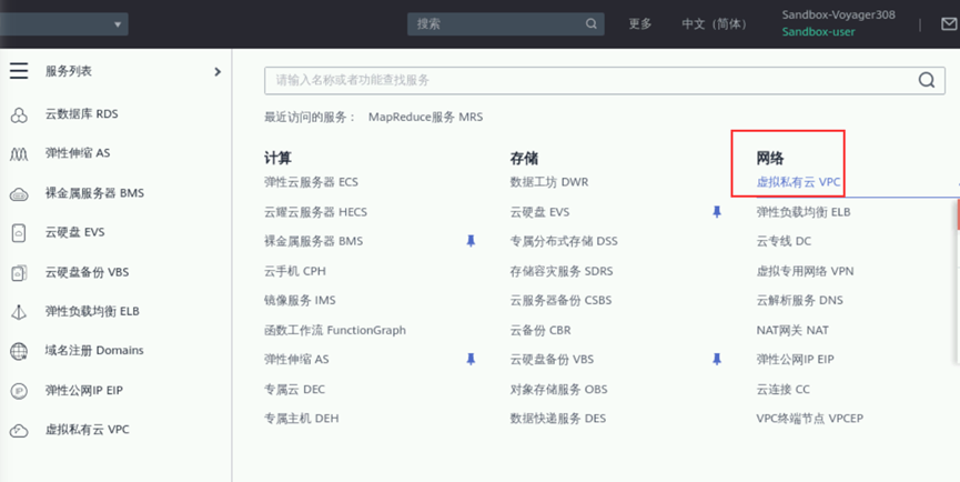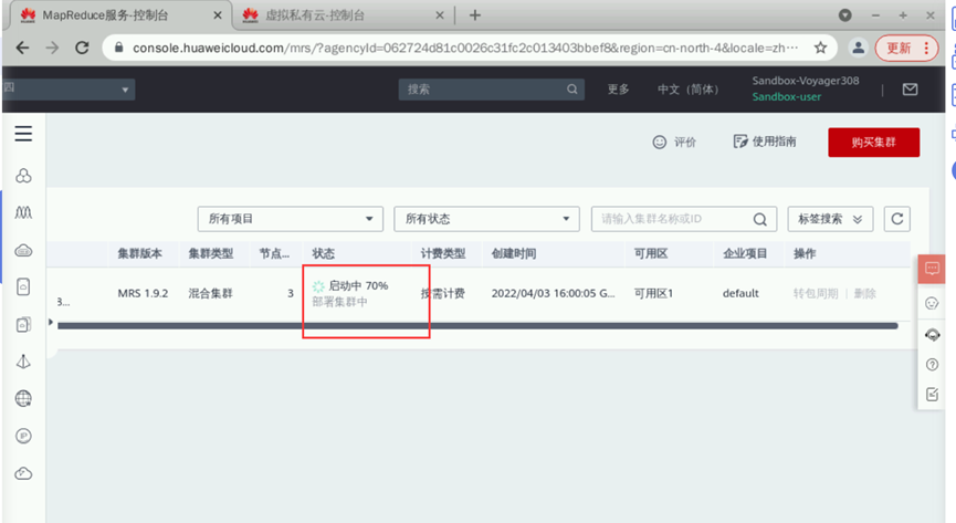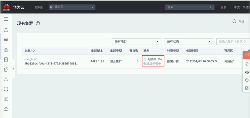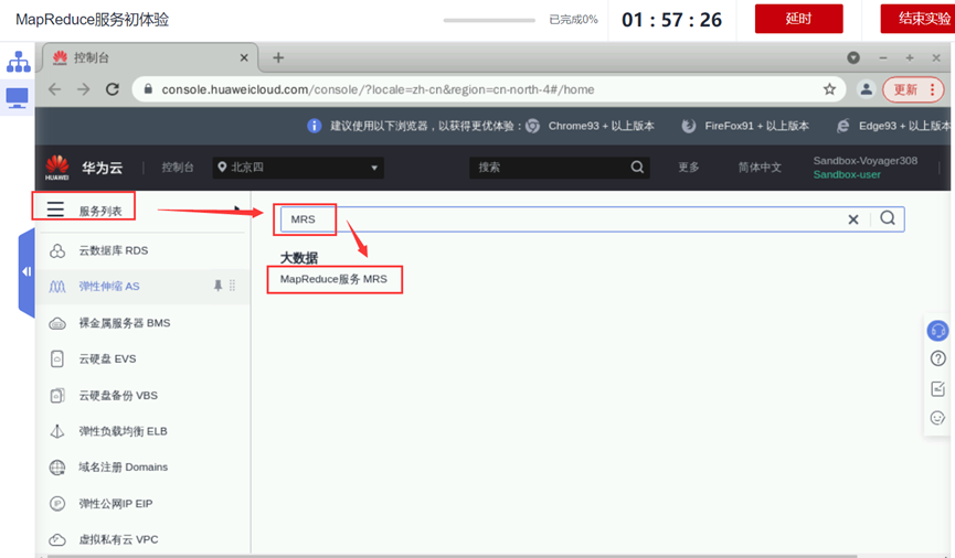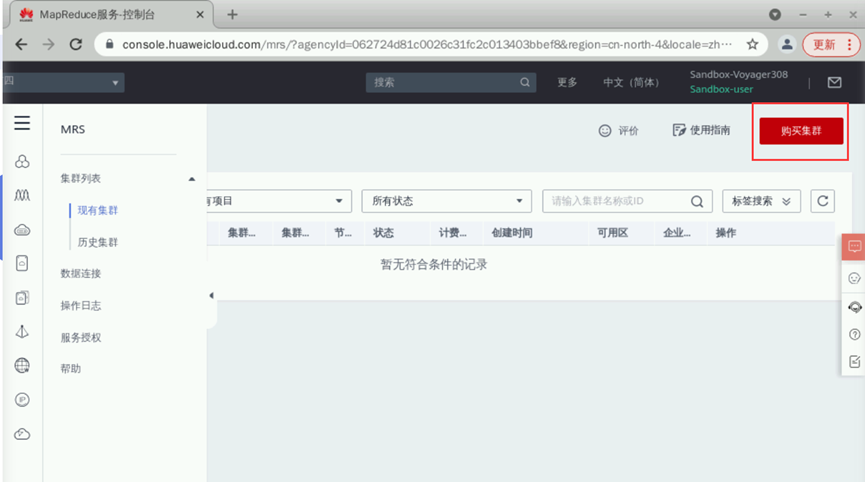 登录华为云完成后点击“控制台”->“服务列表”->“大数据”->“MapReduce服务MRS”进入MRS控制台,如下图所示: