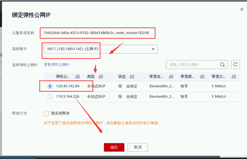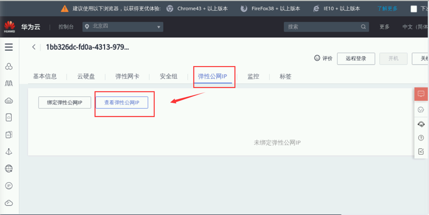 浏览器切回到弹性云服务器的管理控制台页面。点击“绑定弹性公网IP”,网卡默认,勾选选择一个IP,点击“确定”。