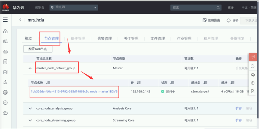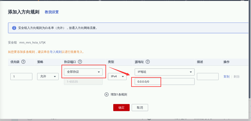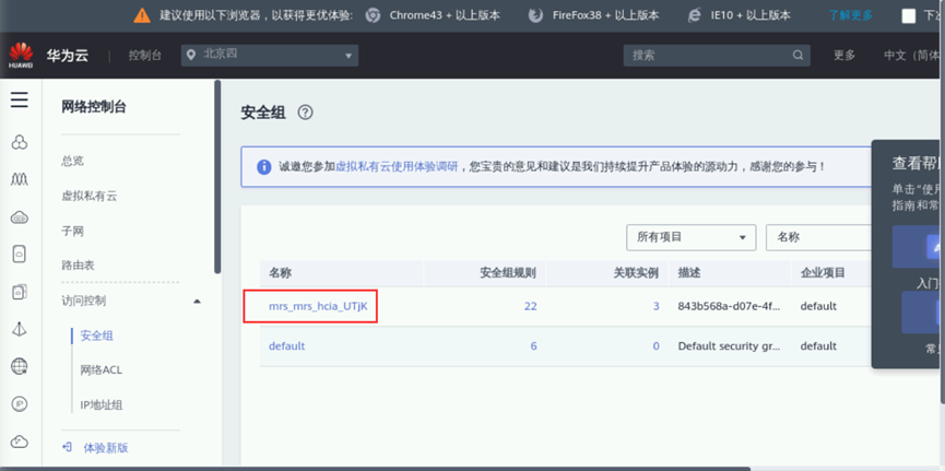 进入虚拟私有云管理界面后,依次单击左侧 “访问控制”->“安全组”,进入安全组管理界面后,点击以mrs开头的安全组。
