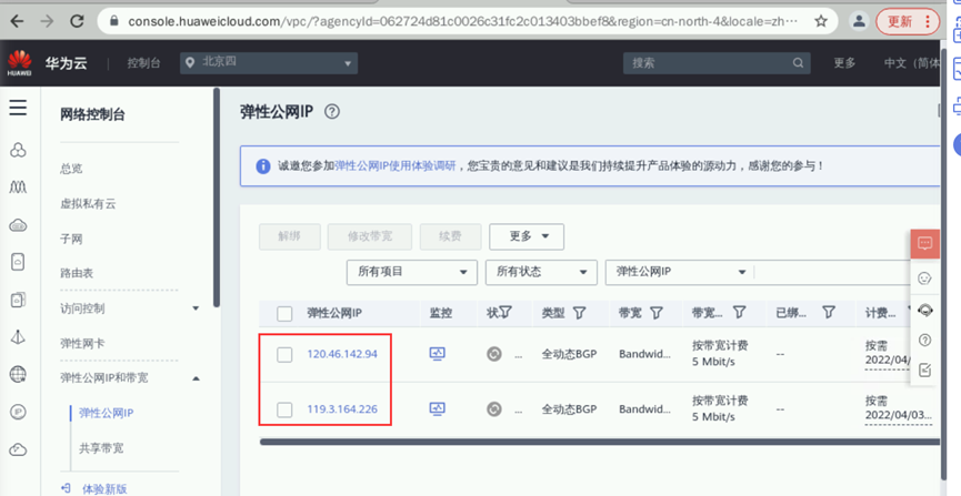 创建后,会出现二个公网IP地址。