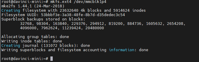 重启之后,执行 mkfs.ext4 /dev/mmblk1p4 格式化分区: