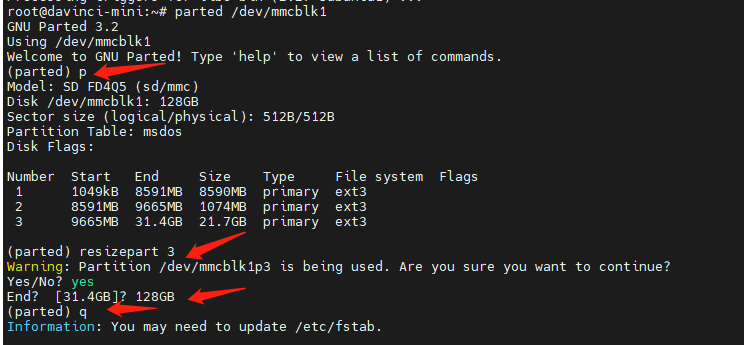 按照上图交互,分别输入p,查看分区情况。然后resizepart 3来扩容分区3. 就是21.7G的那个空间,输入确认扩容:yes,以及扩容的大小是128G(跟Disk的容量一致)