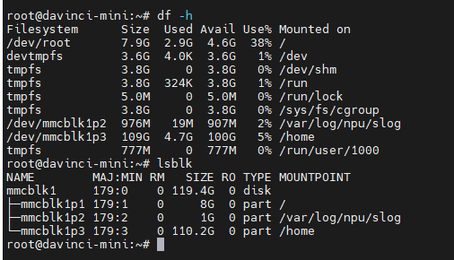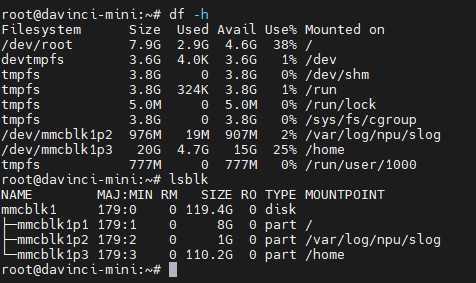 分别使用df -h和lsblk检查文件系统和块设备信息情况: