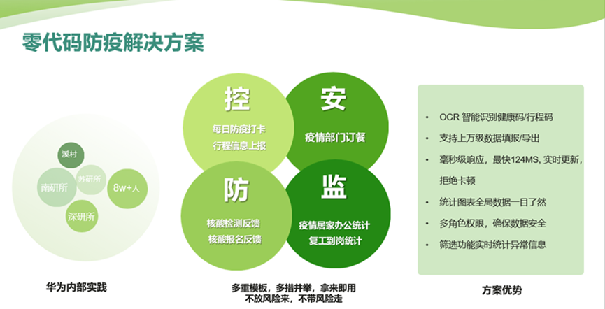 零代码已为华为多个研究所近8万名员工,提供了整套的防疫解决方案,从“控、安、防、监”出发,沉淀了多个防疫模板,如防疫打卡、行程信息上报、疫情部门订餐、核酸检测反馈、核酸接种报名、疫情居家办公统计等,多措并举,拿来即用,自动实时识别风险信息,统计视图方便全局决策。其中疫情打卡模板中OCR功能,能智能识别健康码和行程码,大大解放了人力,提升了统计准确度和效率。