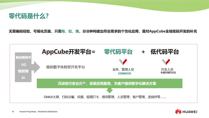 “零代码”作为AppCube家族新成员,经过了华为内部多月的广泛实践和验证,在本次发布会上正式亮相。相比低代码的低门槛,零代码更进一步,使用者无需懂得编码技术,可以从“0”开始,通过简单拖拉拽,分钟级构建应用,人人皆是开发者,刷新开发新模式。