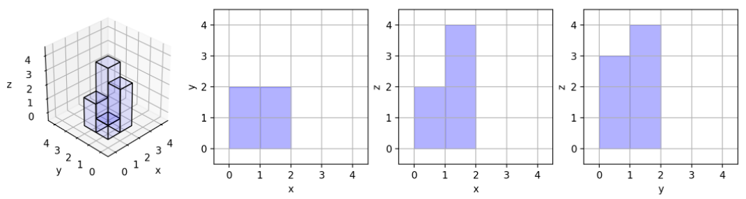 对于正面(yz面),对每一行y方向,取最高的作为每一行正面的投影面积,全部y方向的行的总投影,即为正面的投影面积。