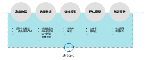 作为解决方案的核心,华为云EI工作流以业务场景为中心,以“定义场景→分布实施→持续迭代→形成闭环”的模式,通过聚焦各行业可落地的AI开发方式,为服务客户提供基于场景化的工作流,完成全流程的AI开发及迭代。