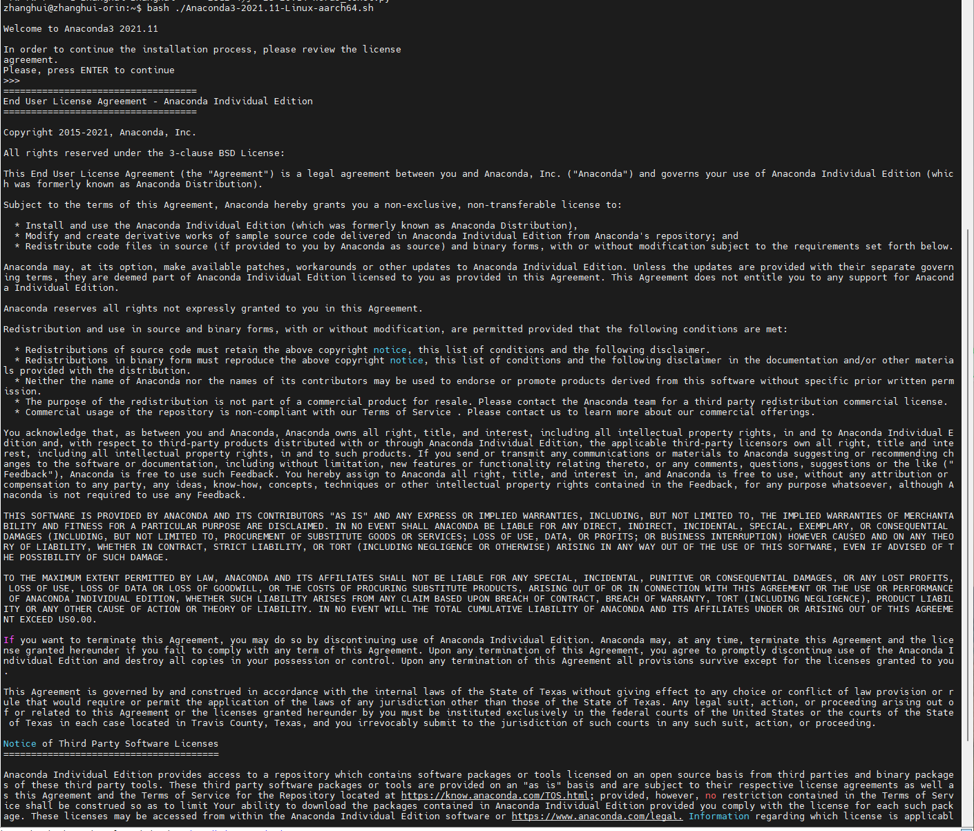 安装: bash ./Anaconda3-2021.11-Linux-aarch64.sh
