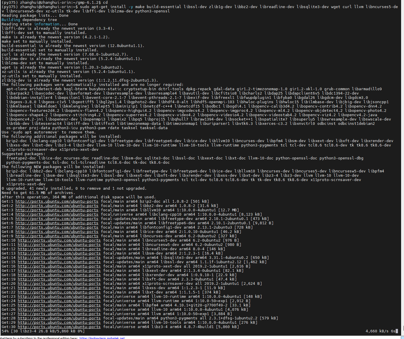 sudo apt-get install -y make build-essential libssl-dev zlib1g-dev libbz2-dev libreadline-dev libsqlite3-dev wget curl llvm libncurses5-dev libncursesw5-dev xz-utils tk-dev libffi-dev liblzma-dev python3-openssl