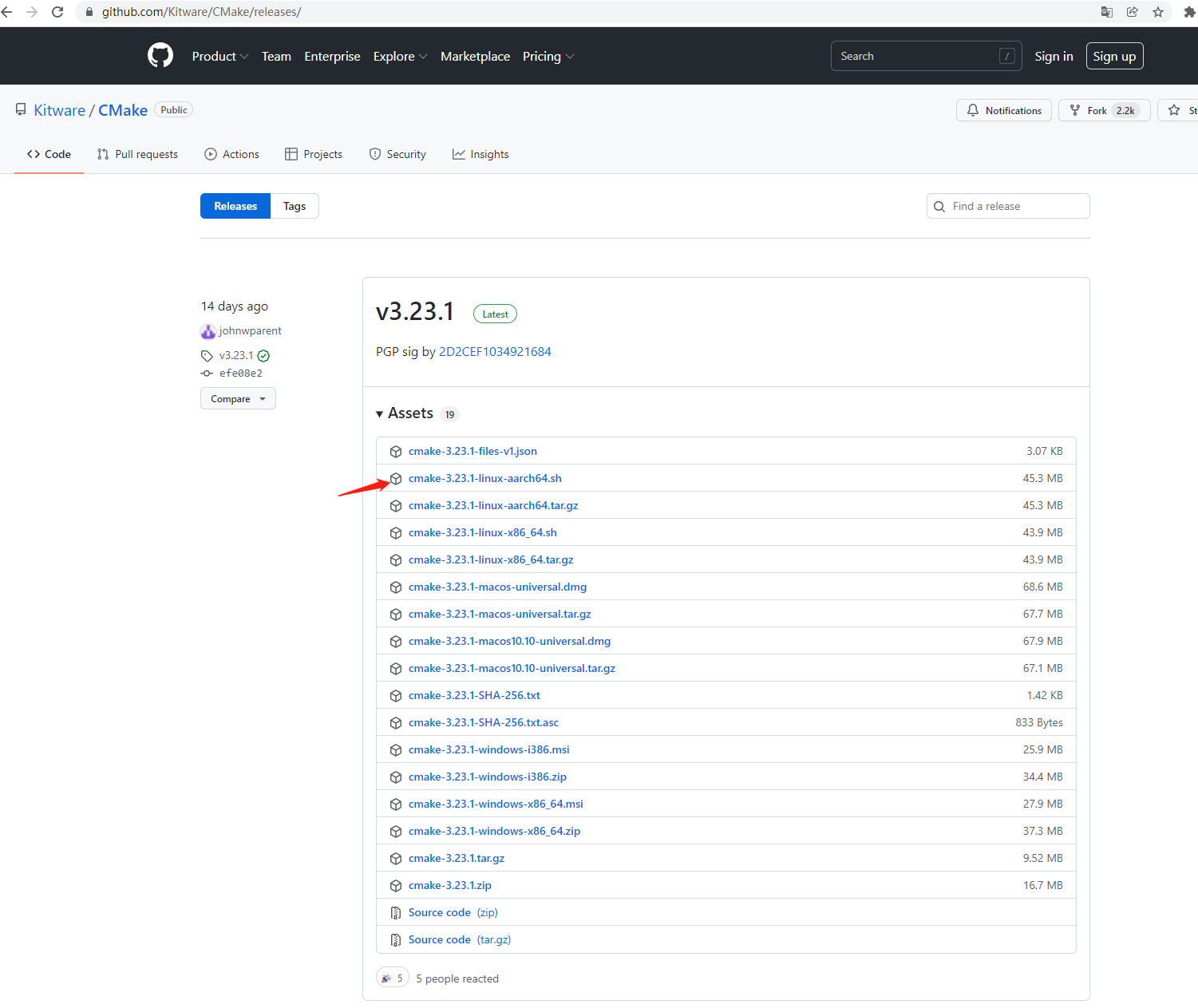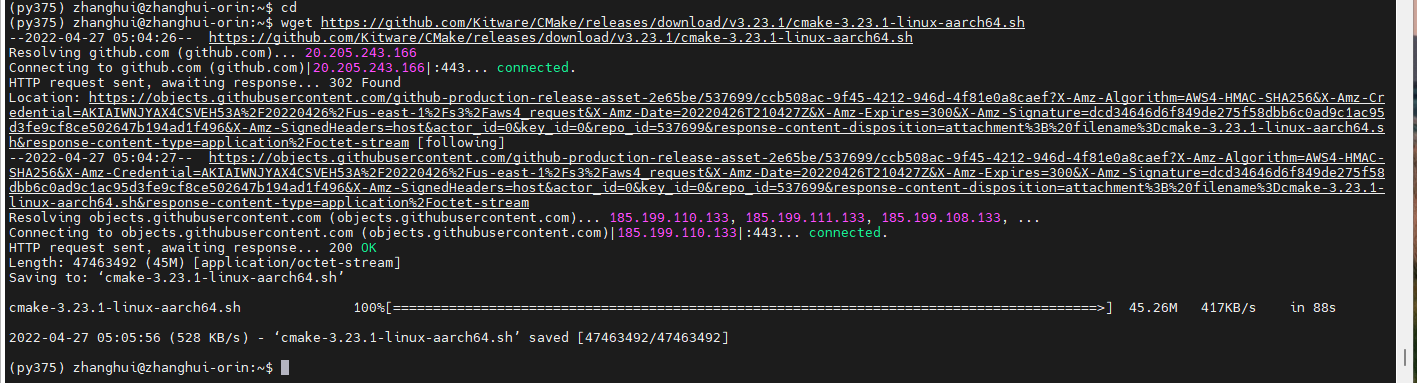wget https://github.com/Kitware/CMake/releases/download/v3.23.1/cmake-3.23.1-linux-aarch64.sh