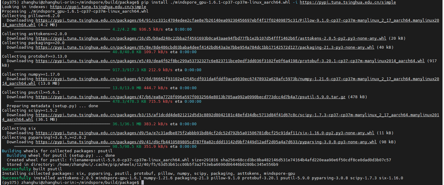 pip install ./mindspore_gpu-1.6.1-cp37-cp37m-linux_aarch64.whl -i https://pypi.tuna.tsinghua.edu.cn/simple