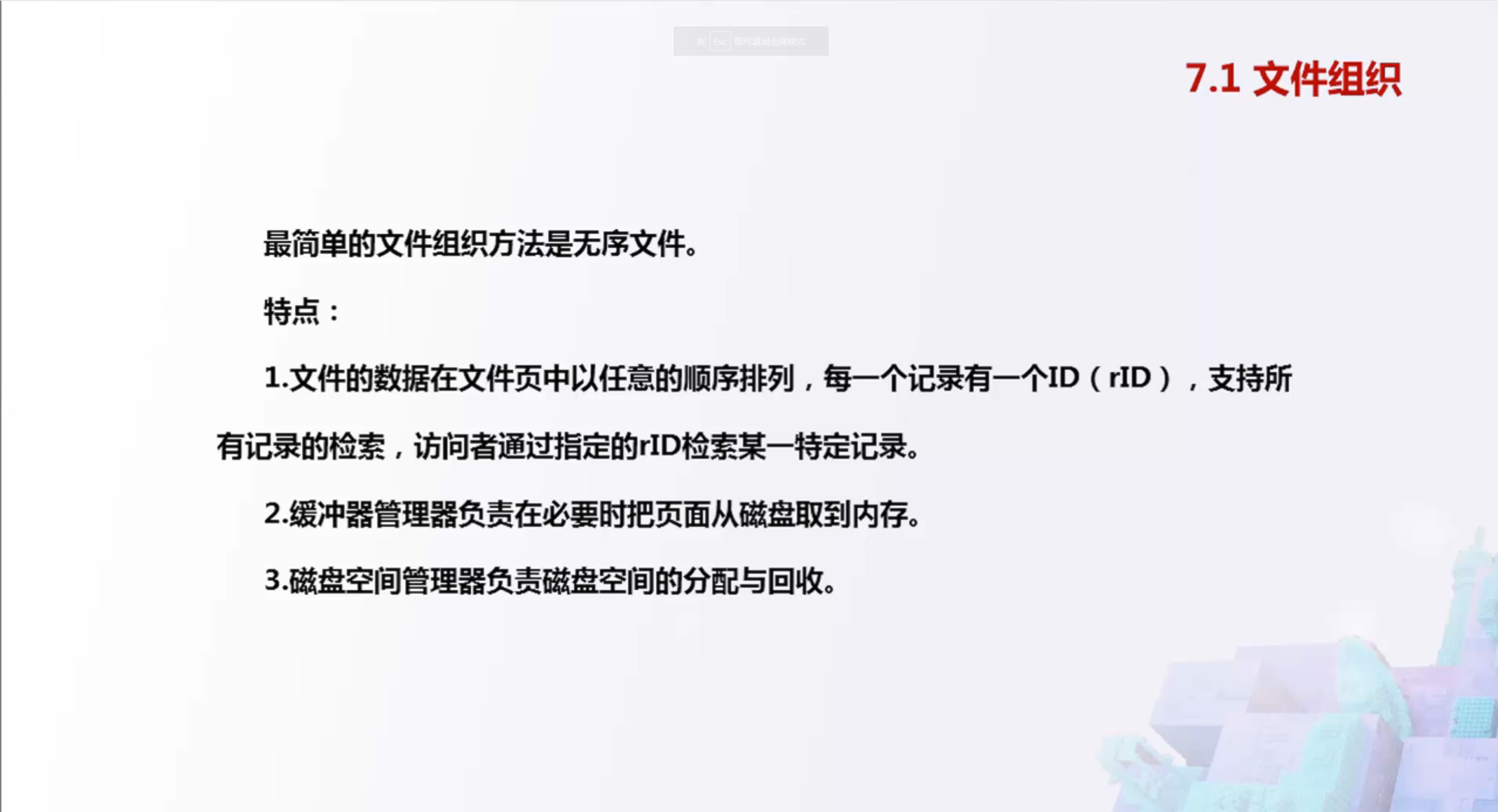 无序文件是最简单的文件组织方式,也就是说文件的数据在文件页中以任意的顺序排列,每一个记录有一个唯一标识符,rID,访问者可通过rID检索到某一条特定的记录。该种文件组织方法要求文件管理器必须跟踪分配给文件的所有页面,处理数据时将数据读入内存,而同时为了持久存储,还需要将数据写回磁盘,上述操作都是由称为缓冲区管理器的软件层实现的。当文件层需要处理某一页数据时,向缓冲区管理器取出该页,并指定rID,而如果所请求的页面不在内存中,则将数据从磁盘读入内存。磁盘上的空间是由磁盘空间管理器负责的,当文件层需要额外磁盘空间保存新记录时,它就会请求磁盘空间管理器分配一个新的页面以保存数据。当文件不再需要该磁盘页时,他也会通过磁盘空间管理器释放该空间。