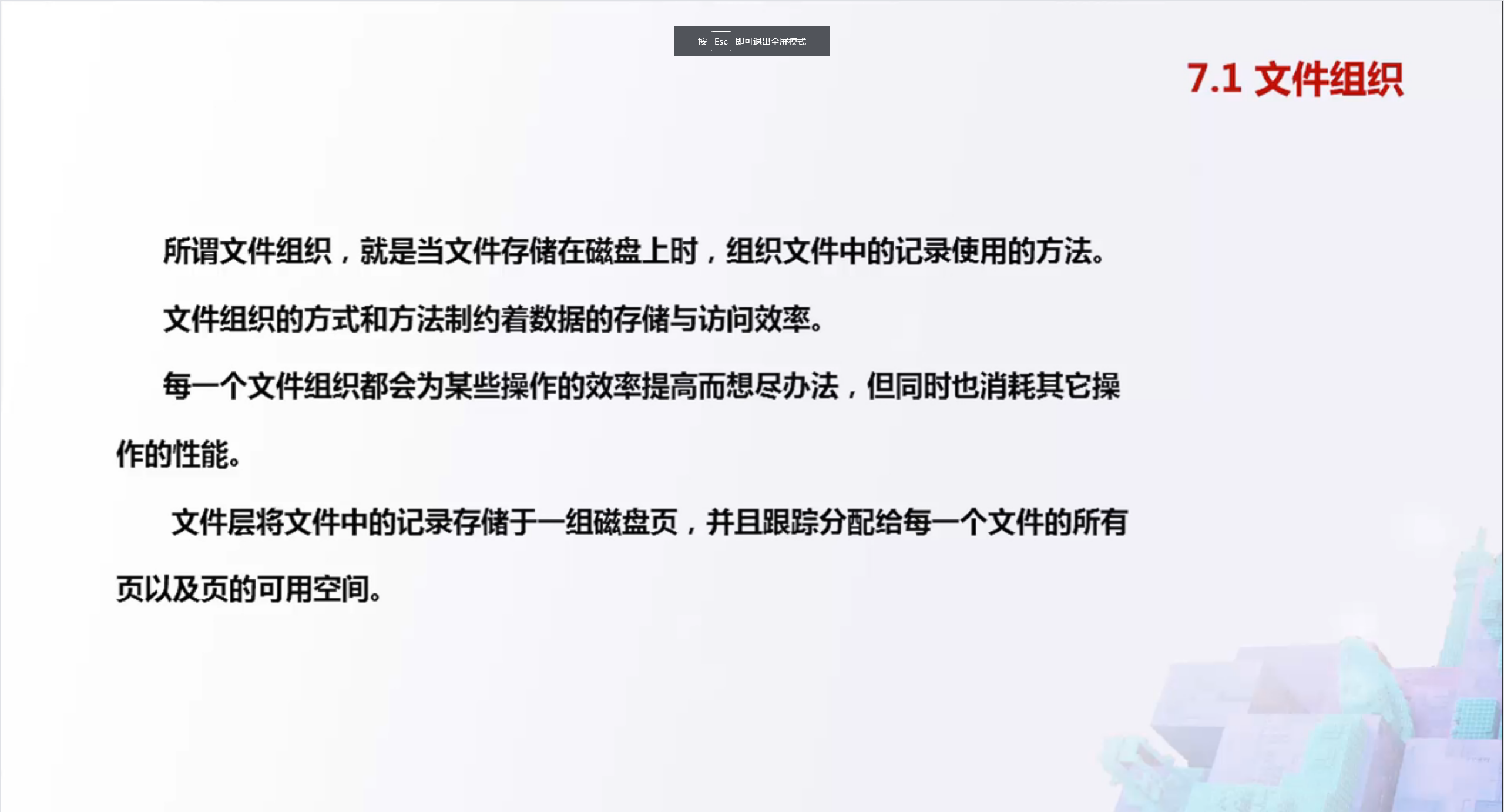 在了解数据以文件的形式存储之前,我们有必要先了解什么是文件组织。文件组织就是当文件存储在磁盘上时,组织文件中的记录所使用的方法,其组织的方式和方法制约着数据的存储与访问效率。我们知道数据库是将数据存储在外部存储器中的,计算时需要将数据加载到内存后处理,不同的DBMS在读取方式上也是几乎迥异。所以每一个文件组织都会为某些操作的效率提高而想尽方法,但同时也消耗其他操作的性能。通过访问层代码,可以创建、删除文件,向其中插入或者删除记录。还可以进行查询操作,以一次访问一个记录的方式来遍历文件上的所有记录。文件层将文件中的记录存储于一组磁盘页,并且跟踪分配给每一个文件的所有页以及页的可用空间。