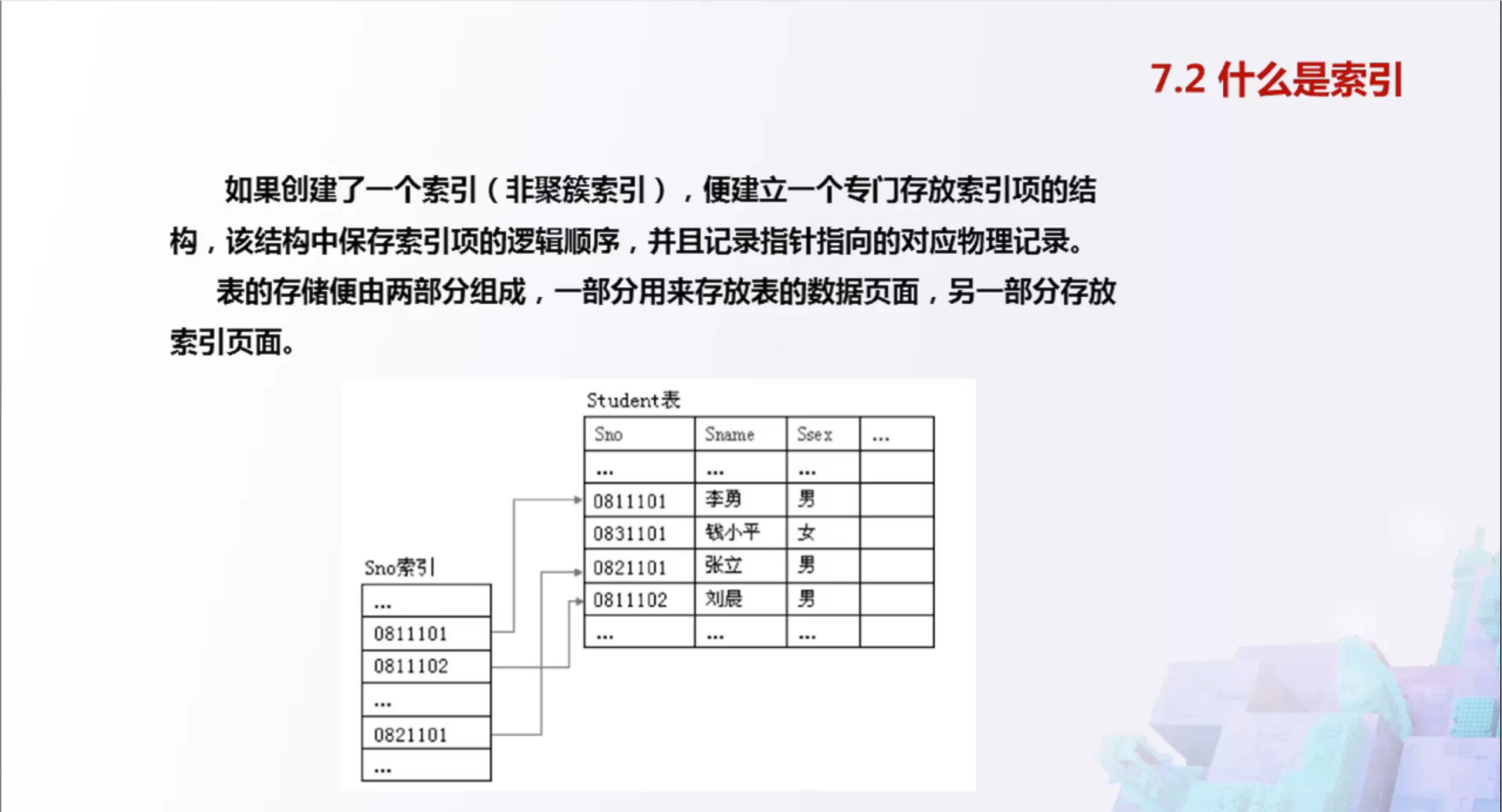 ● 索引时在保重的字段基础上建立的一种数据库对象,由数据库管理员或表的拥有者负责创建和撤销,而其他用户不能随意创建和撤销。