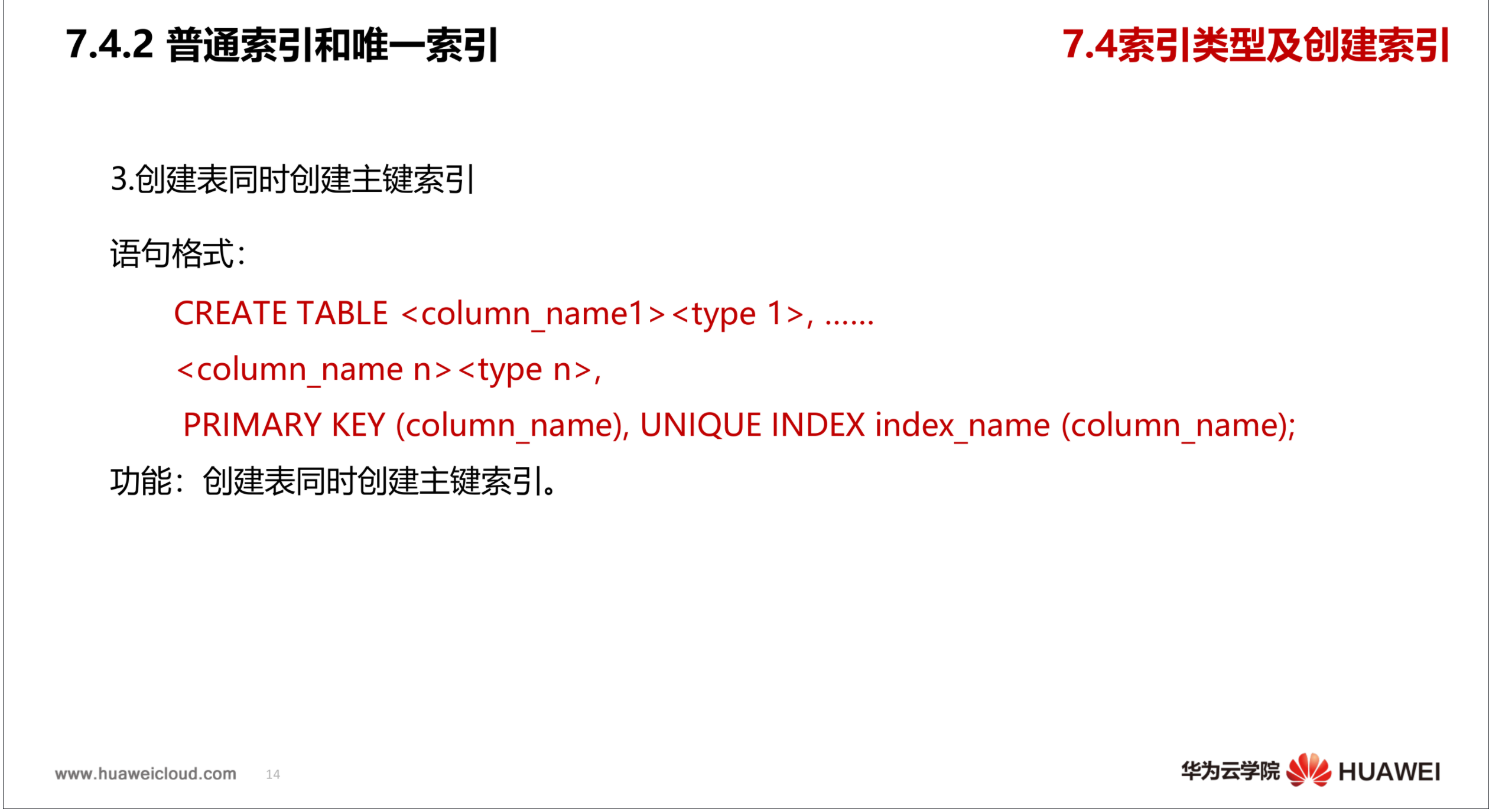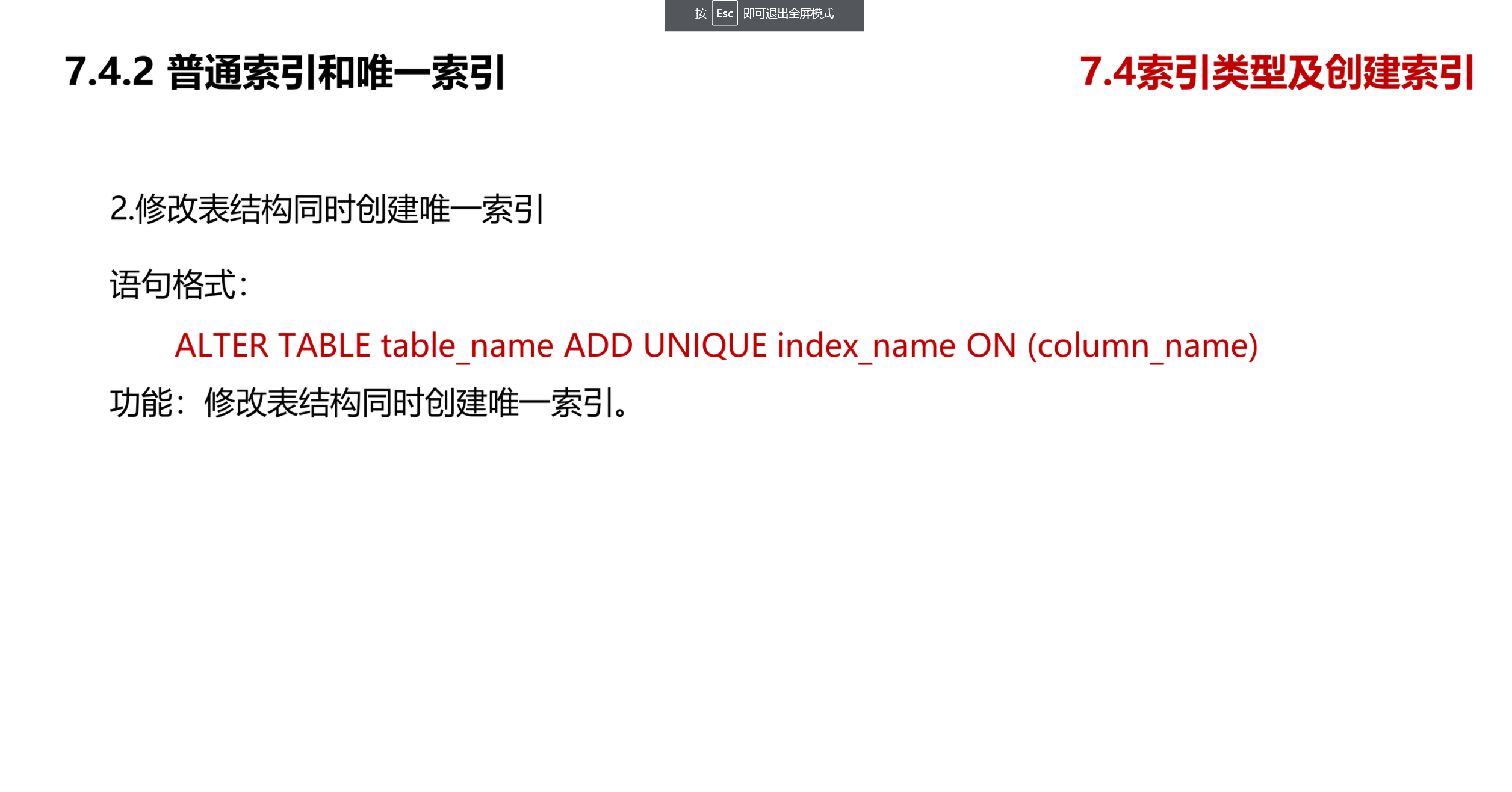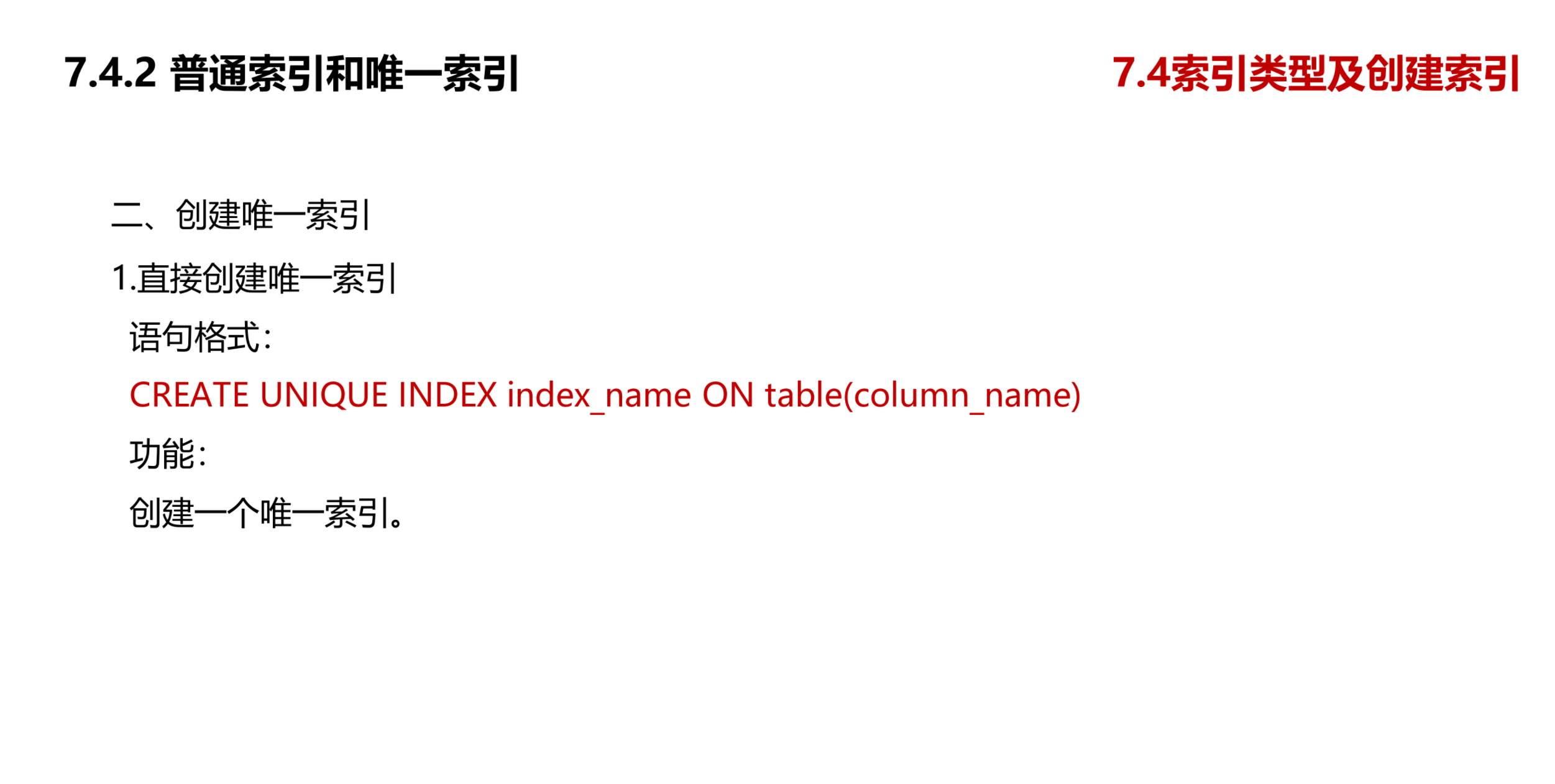 而唯一索引的创建方式与普通索引的创建方式是类似的,只需要在INDEX前加上UNIQUE参数即可。而需要注意的是,唯一索引要求索引列的取值是唯一的,具体如下图所示: