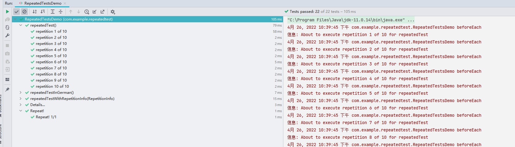 repeatedTest()方法与上面的示例相同;repeatedTestWithRepetitionInfo()演示了如何将RepeatInfo的实例注入到测试中,以访问当前重复测试的重复总数。