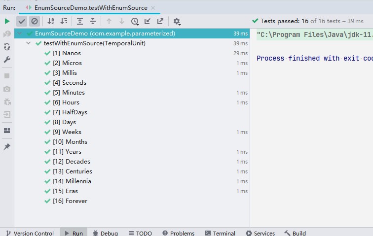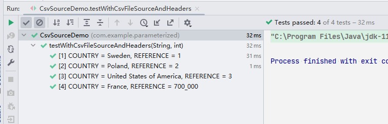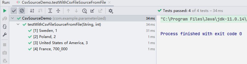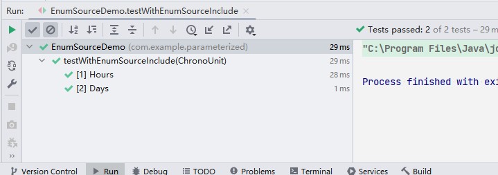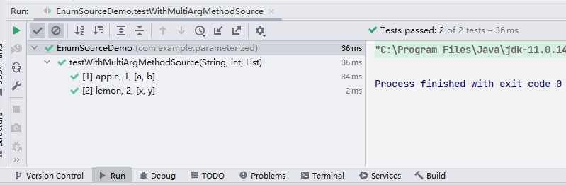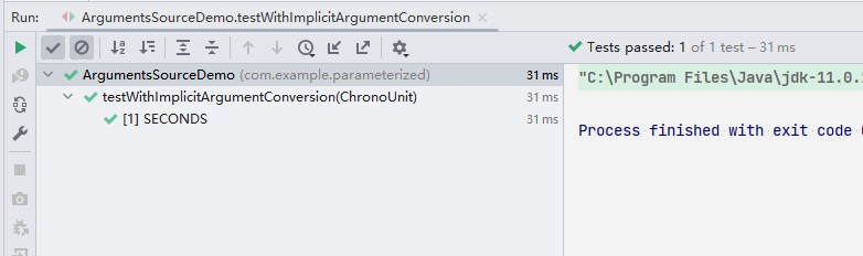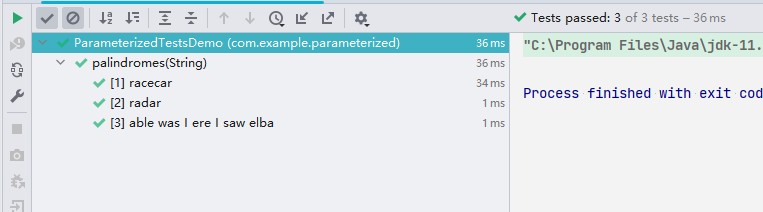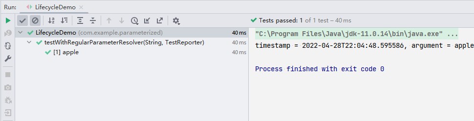 参数化测试的每次调用都具有与常规@Test方法相同的生命周期。例如,@BeforeEach方法将在每次调用之前执行。与动态测试类似,调用将出现在IDE的测试树中。可以在同一个测试类中随意混合常规的@Test方法和@ParameterizedTest方法。