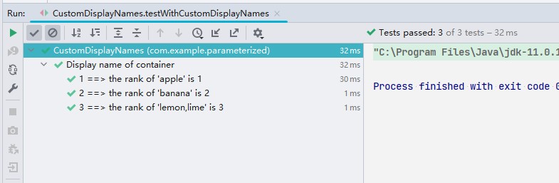 但是可以通过@ParameterizedTest注解的name属性自定义调用显示名称,如下例所示。
