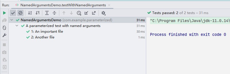 默认情况下,参数化测试调用的显示名称包含调用索引和该特定调用的所有参数的字符串表示形式。如果存在于字节码中(对于 Java,必须使用-parameters编译器标志编译测试代码),它们中的每一个前面都有参数名称(除非该参数只能通过ArgumentsAccessor或ArgumentAggregator获得)。