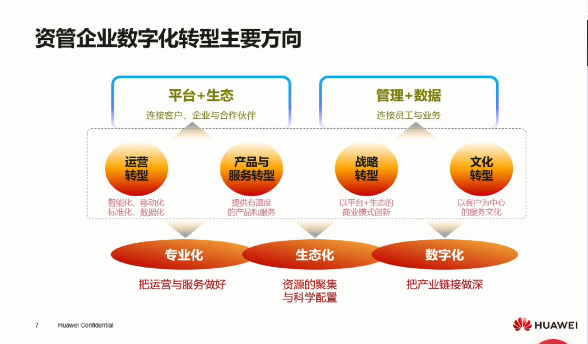 资管企业数字化转型二个主要方向:平台+生态——连接客户、企业与合作伙伴、管理+数据——连接员工与业务。