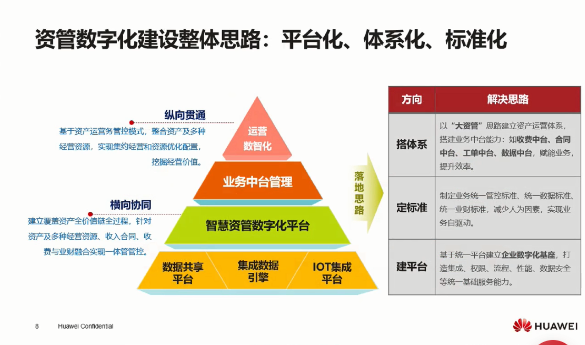 资产运营企业朝数字化体系建设仍然有许多工作,首先要解决统一平台;第二业务模式定位;第三新技术新设备支撑经营管理和用户体验;第四数据中心和业务中台建设。