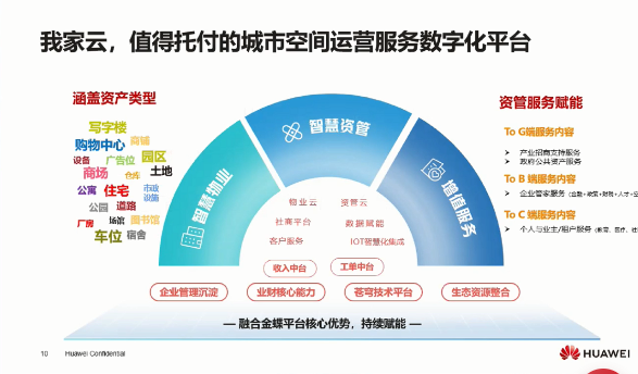 我家云基于资产运营维度提供智慧物业、智慧资管、增值服务三大数字能力建设内容,涵盖资产各种类型。