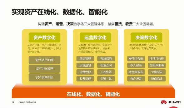 在整个建设过程当中,我们围绕着实现资产在线化、数据化、智能化目标,构建资产、运营、决策数字化三大管理体系,聚焦租赁、收费二大业务场景。