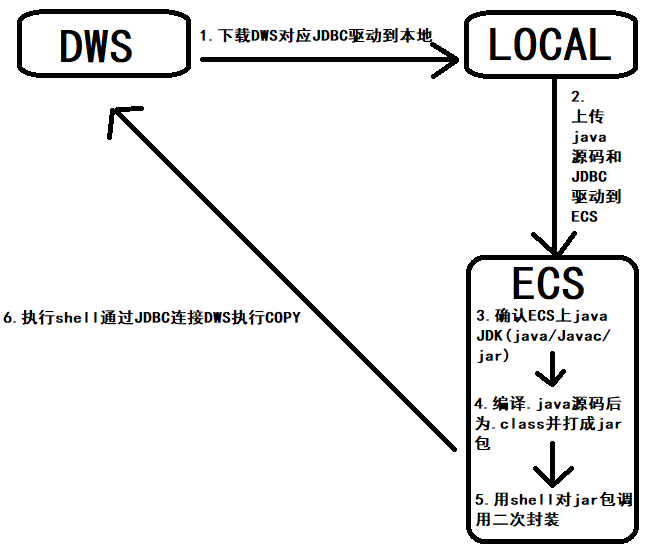 DWS云数仓的用户,因为业务需要或者进行如TPC-DS等模型性能摸底时。存在从文件导入大量数据到DWS,或从DWS导出数据到ECS上的数据文件的使用需求。DWS云数仓支持JDBC的远程连接,并且管理界面提供DWS数仓对应JDBC驱动的下载。用户仅需下载对应DWS版本的驱动,和java源码同时上传到ECS,进行编译打包后,即可通过JDBC实现COPY导入或者导出。如果用shell对JDBC调用进行二次封装,可以更进一步简化使用步骤,降低维护成本。
