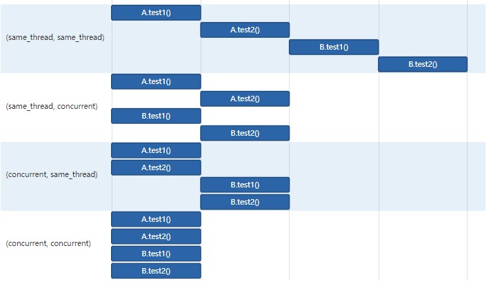 下图说明了对于junit.jupiter.execution.parallel.mode.default和junit.jupiter.execution.parallel.mode.classes.default这四个组合,执行两个顶级测试类A和B以及每个类两个测试方法的行为(请参阅第一列中的标签)。
