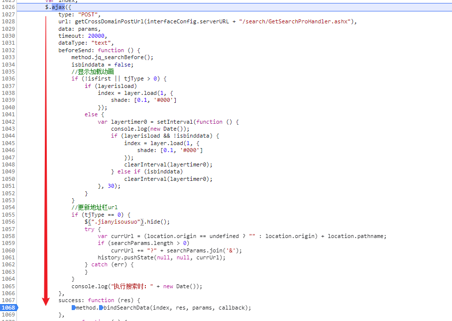 接下来在 method.bindSearchData(index, res, params, callback); 处添加断点,接着运行请求,代码会停在 success 处。