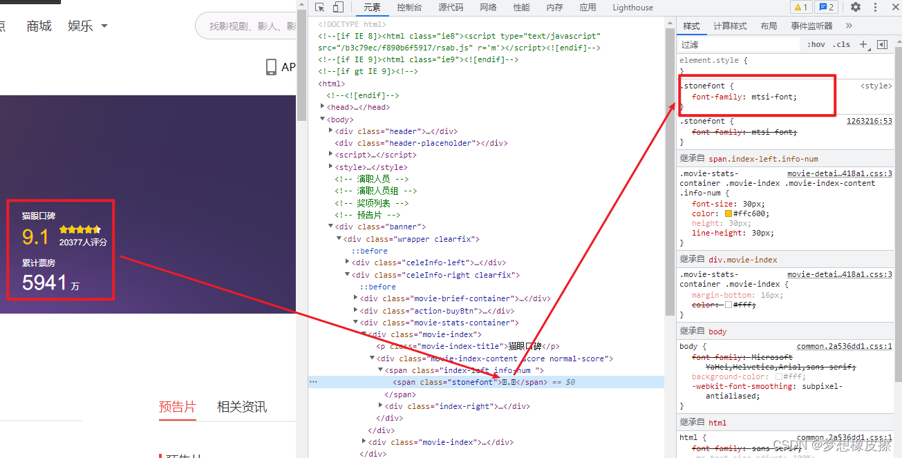 我们在用 Element 抓取一下元素内容,可看到目标数据引用了一个特殊的字体样式 mtsi-font