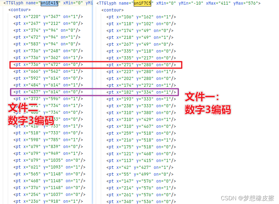 对比两个文件中关于数字 3 的编码,可以看到出现了细节差异,此时得到的一个结论就是,MAOYAN 除了字体编码变化外,字体渲染的坐标也发生了变化。