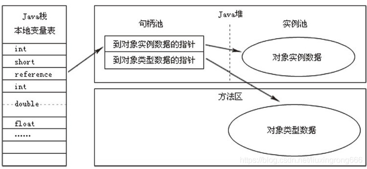 如果使用句柄访问方式,java堆中将会划出一块内存来作为句柄池,reference中存储的是对象的句柄地址,而句柄中包含了对象实例数据和类型数据各自的具体地址信息,如图所示: