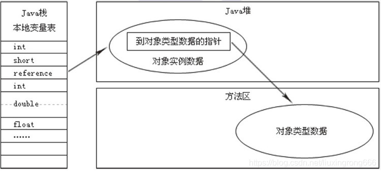 如果使用指针直接访问的方式,java对象的布局中就必须放置有访问类型数据的指针,而reference中直接存储的是对象的地址,如图所示: