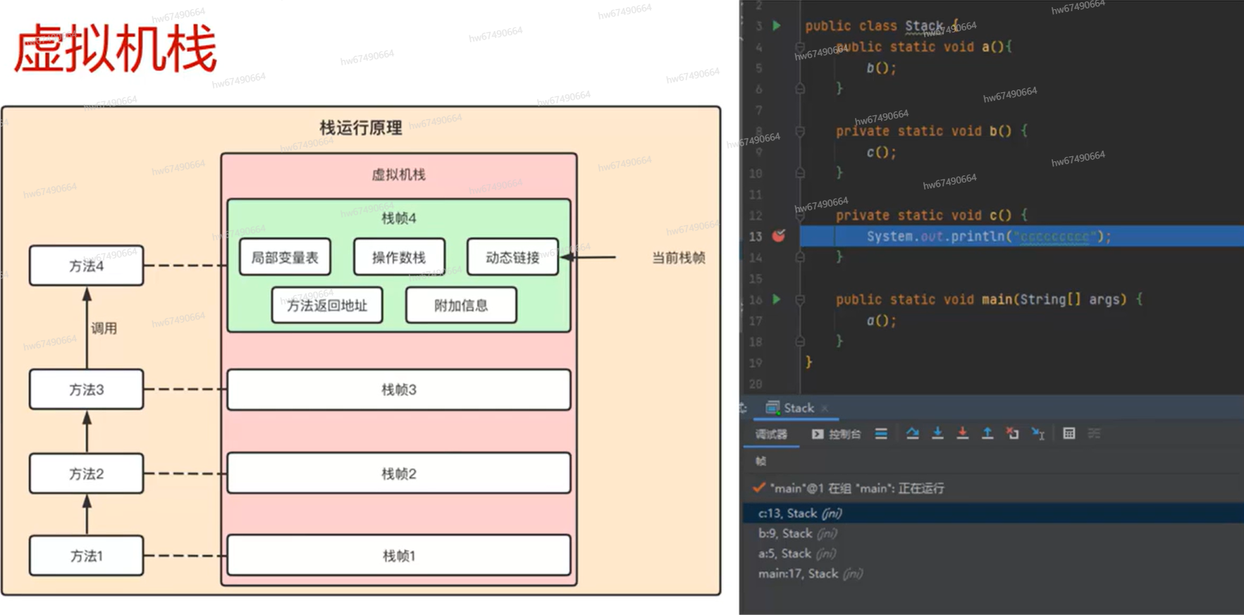 看上面代码,我写了三个方法,A方法调用B方法,B方法调用C方法,然后C方法打印一行日志,然后我们debug,可以看到调试器有三个栈进行压栈,可以看到从上到下ABC一次入栈,那么CBA依次出栈,这个所谓栈帧;当然这个栈帧存的数据如局部变量表,操作数栈以及动态链接等,我们可以看这个局部变量在栈帧里变化是否符合我们预期;