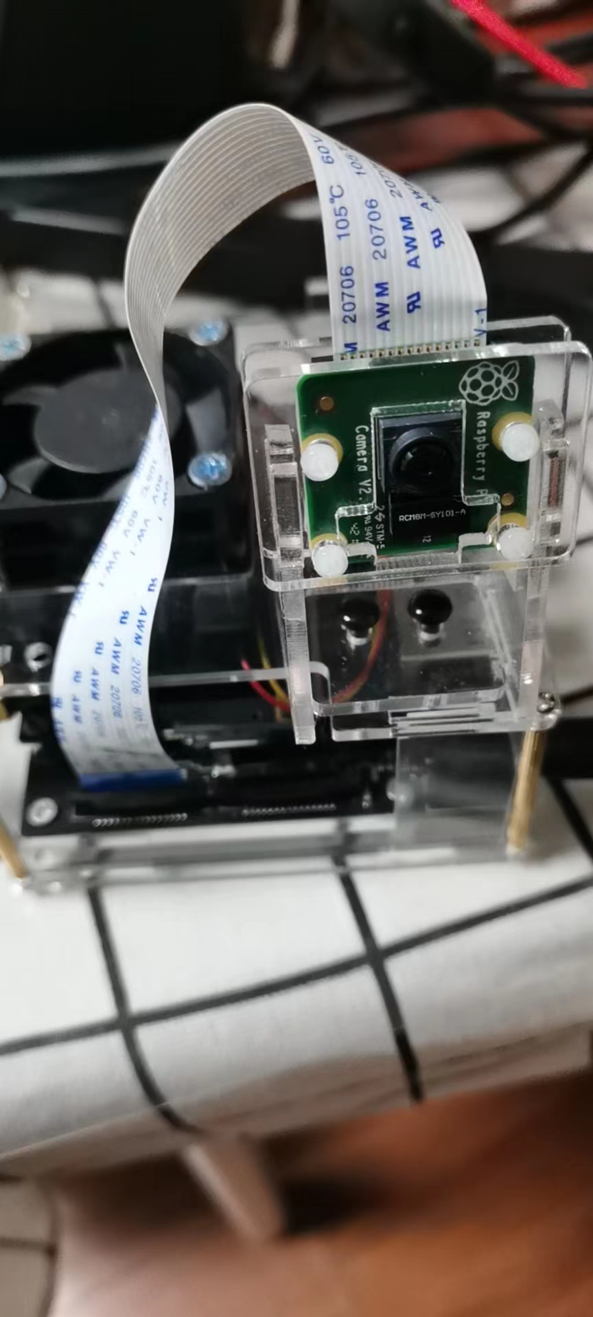 其实张小白这个就做得不好看。因为原本张小白以为摄像头端的排线是从下面走的,结果接上一试,图像是反的。只有排线往头顶上接,图像才是正的。结果就让这个摄像头的走位如此妖娆。。。