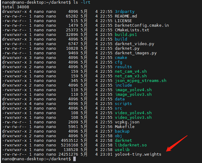 下载 https://github.com/AlexeyAB/darknet/releases/download/darknet_yolo_v4_pre/yolov4-tiny.weights 并传递到nano上: