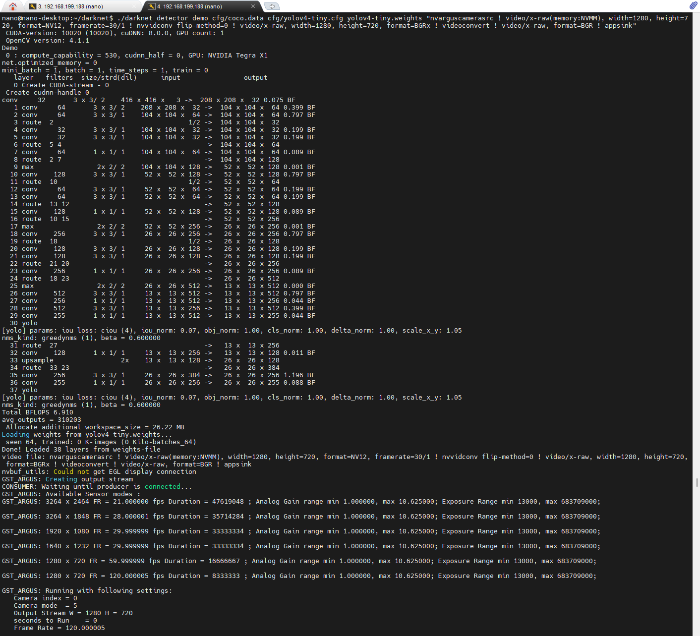 ./darknet detector demo cfg/coco.data cfg/yolov4-tiny.cfg yolov4-tiny.weights ”nvarguscamerasrc ! video/x-raw(memory:NVMM), width=1280, height=720, format=NV12, framerate=60/1 ! nvvidconv flip-method=0 ! video/x-raw, width=1280, height=720, format=BGRx ! videoconvert ! video/x-raw, format=BGR ! appsink“