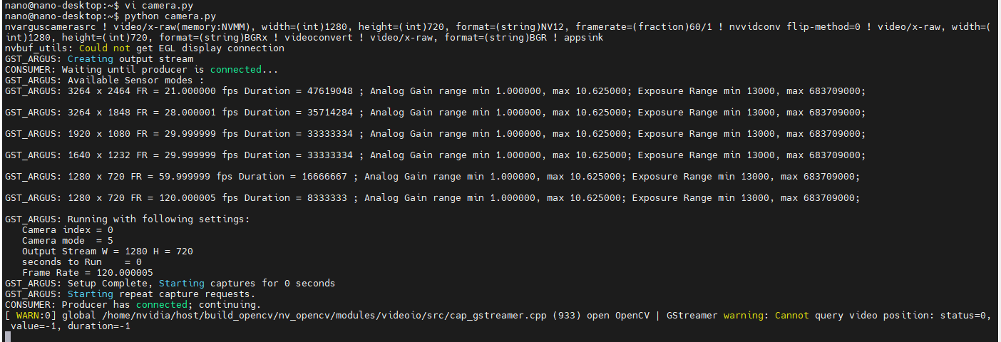 nvarguscamerasrc ! video/x-raw(memory:NVMM), width=(int)1280, height=(int)720, format=(string)NV12, framerate=(fraction)60/1 ! nvvidconv flip-method=0 ! video/x-raw, width=(int)1280, height=(int)720, format=(string)BGRx ! videoconvert ! video/x-raw, format=(string)BGR ! appsink