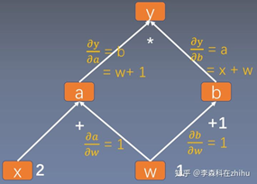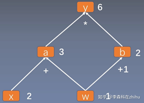 我们把x+w求和的过程用节点a表示,w+1求和的过程用节点b表示,a*b求积的过程用节点y表示,那么整个计算过程就能用一个计算图表达出来: