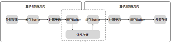 融合前,算子1在昇腾AI处理器上计算完后,将数据从昇腾AI处理器内的缓存buffer搬运到外部存储,算子2从外部存储获取数据作为输入,搬入缓存buffer进行计算。