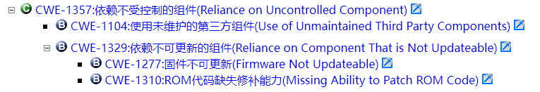 在研究者视图(CWE-1000)中,此弱点被放在编程规范违背(CWE-710)下,并包含已有的两个CWE:使用未维护的第三方组件( CWE-1104)和