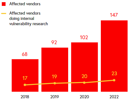 2021年漏洞影响147家ICS供应商,比2020年的102家增加了44%。
