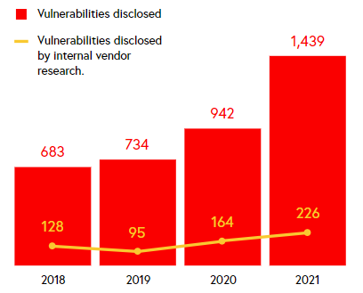 2021年共计披露了1439个ICS漏洞,比2020年的942个增加了53%。