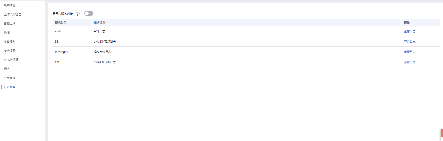 1、创建数据仓库服务集群后进如集群详情 左侧有日志服务的页签点击进入后会出现以下界面,可以开启日志开关服务开启后出现如下日志列表,一次显示了所有支持的日志。