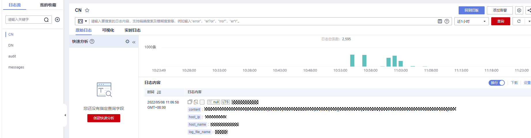2、在上图中可以看到日志列表有DN、CN、message、audit日志,查看日志进入的日志服务界面 选择时间进1h可以看到下放有很多日志,这里就可以参考云日志的帮助稳档进行日志的搜索删选