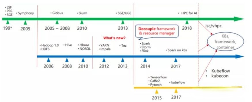 上图是我们做的一个分析,我们将其分为三层,最下面是资源管理层,中间为领域的框架,包括AI的体系、HPC、Batch, WKflow的管理以及像现在的一些微服务及流量治理等。再往上是行业以及一些行业的应用。