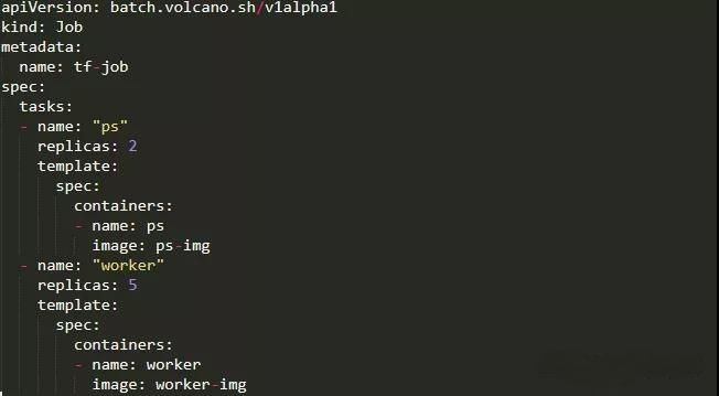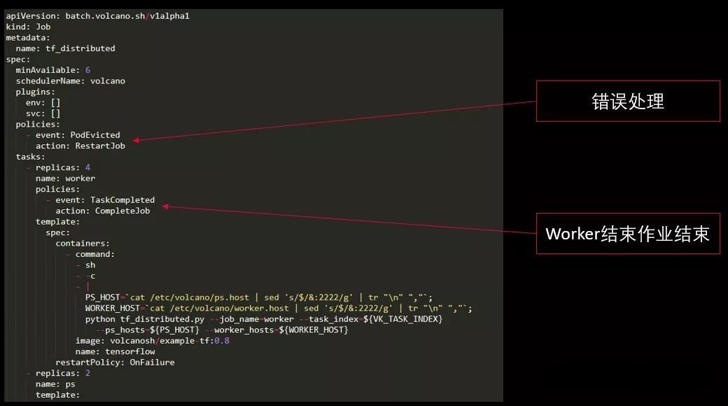 TaskSpec结构体里除包含最基本的信息外,还有一个policies, policy就定义了Task的生命周期。因为一个Job里会有多个 Task,就像下图描述的如何用Vocano运行一个Tensorflow的Job,Task里面就有多个角色,不同的角色可以定义它自己的 port template,这样的话我们就可以通过一个统一的Volcano Job支持不同的作业类型。