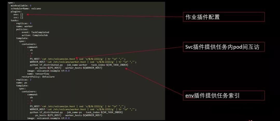 其实有一些定制化的需求。好比说分布式训练这种作业,它在多个pod跑起来之后,它的pod和pod之间需要有网络互访,做数据同步。 对于像这种类型的需求,我们通过插件化的机制做成job plugin,让用户去通过这种方式去支撑它的场景。