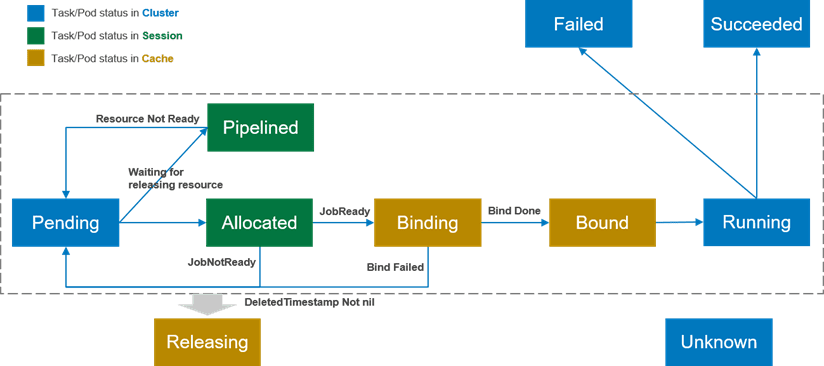- Pipelined: 该状态与Allocated状态相似,区别在于处于该状态的Pod分配到的资源为正在被释放的资源 (Releasing)。该状态主要用于等待被抢占的资源释放。该状态是调度周期中的状态,不会更新到kube-apiserver以减少通信,节省kube-apiserver的qps。
